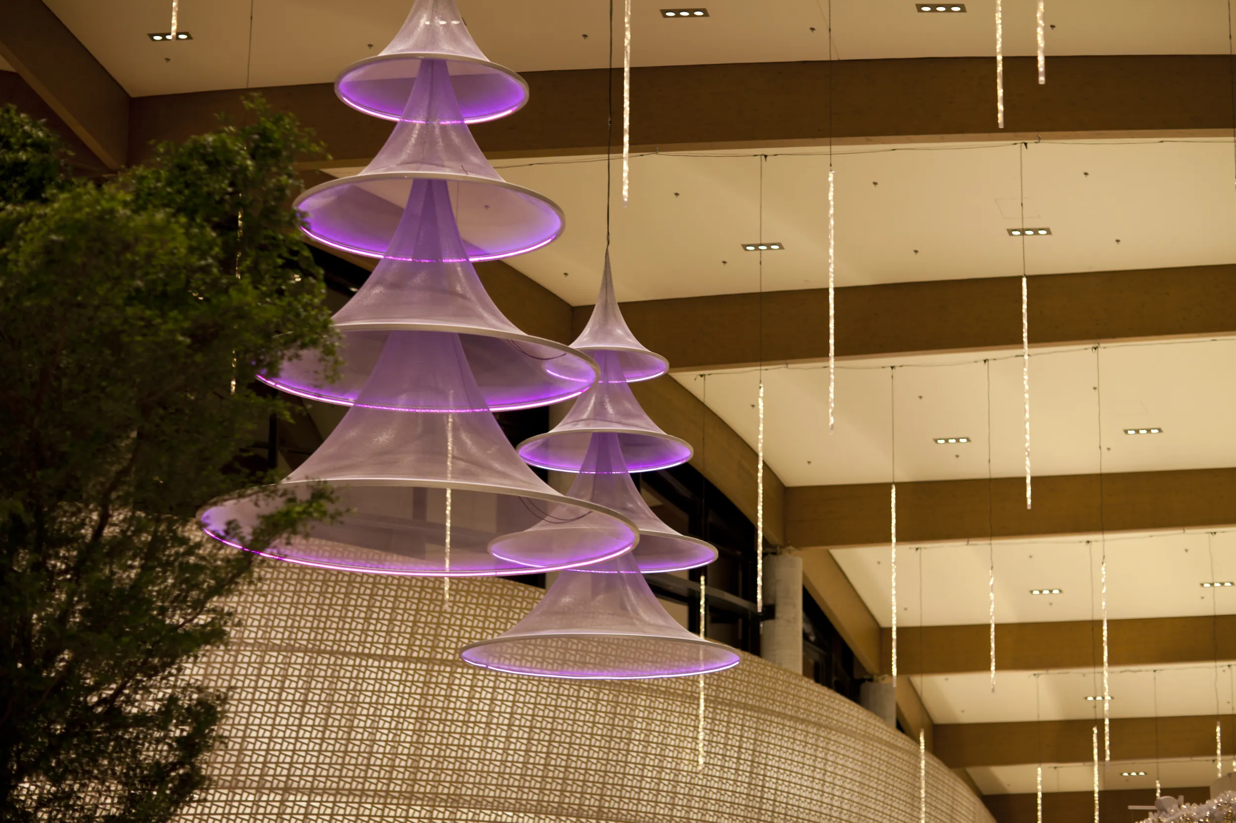 Beleuchtete moderne Weihnachtsbäume für große Gebäude.