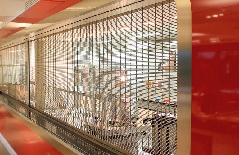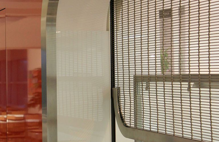 Der ca. 10 m breite und ca. 1,80 m hohe Behang Tigris beeindruckt optisch durch die futuristisch abgerundeten Ecken, mit einem Radius von 19 cm. Der zweiteilige Behang ist mittig durch ein Glasschwert separiert und an zwei Führungsschienen befestigt, so dass die Trennung kaum auffällt. Das herabfahrende Gewebe nimmt im Endstab die Rundungen führungslos auf und behält über spezielle Halterungen in der Führungsschiene seine