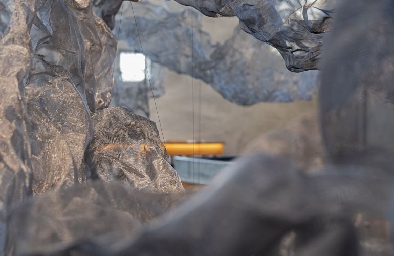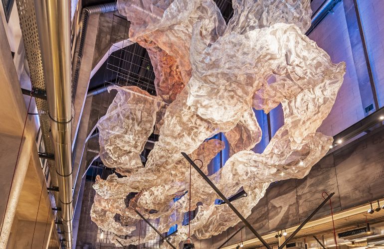 Deckengestaltung für einen hohen Raum aus Metall, die Wolken nachbilden.