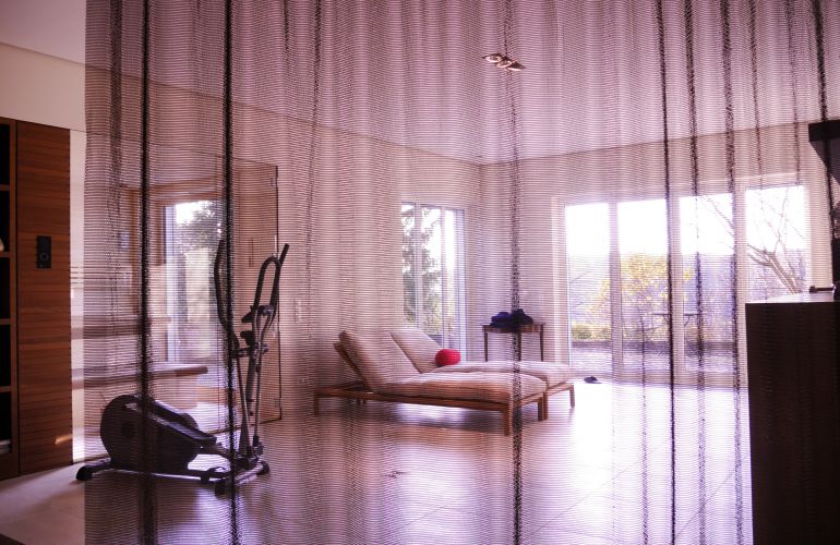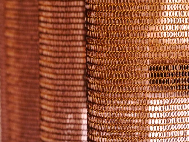 Durch die gedrehte Variante des Ringgeflechts erreicht man eine außergewöhnliche Textur des Materials. Die Blickdichtigkeit erhöht sich. Es entsteht ein Spiel zwischen Transparenz und Raumtrennung. Der Raum erhält seine Größe und wird in seinen Bereichen geteilt.