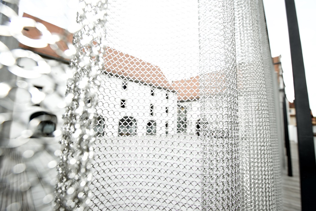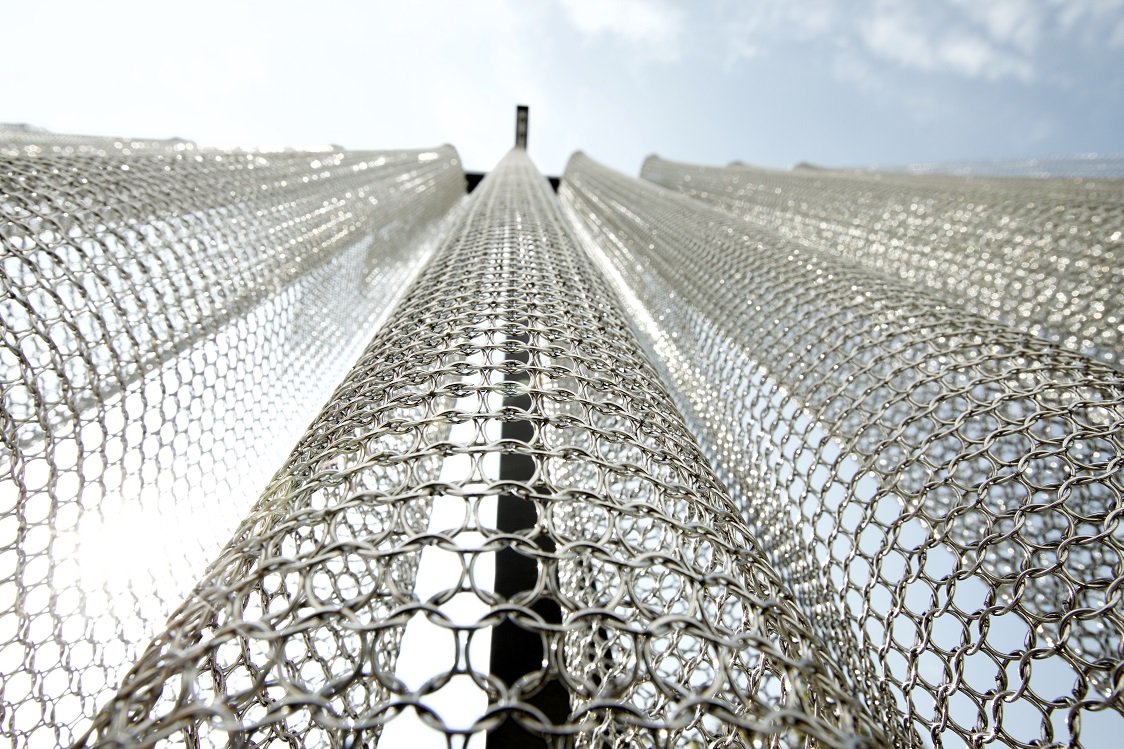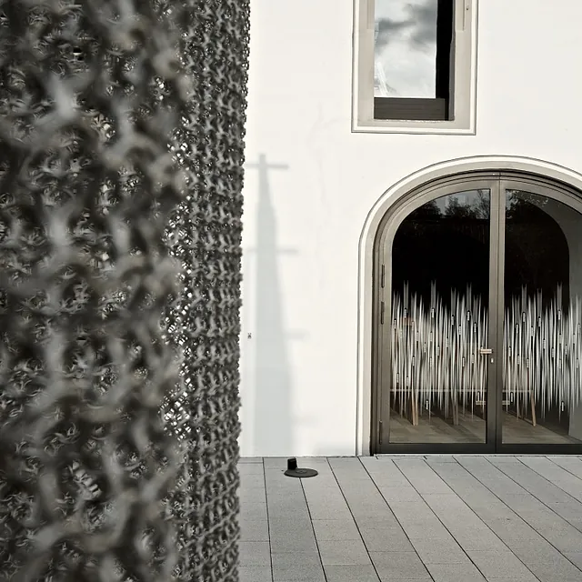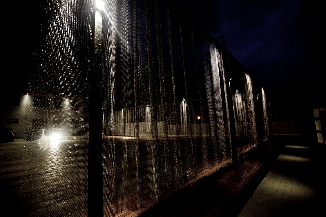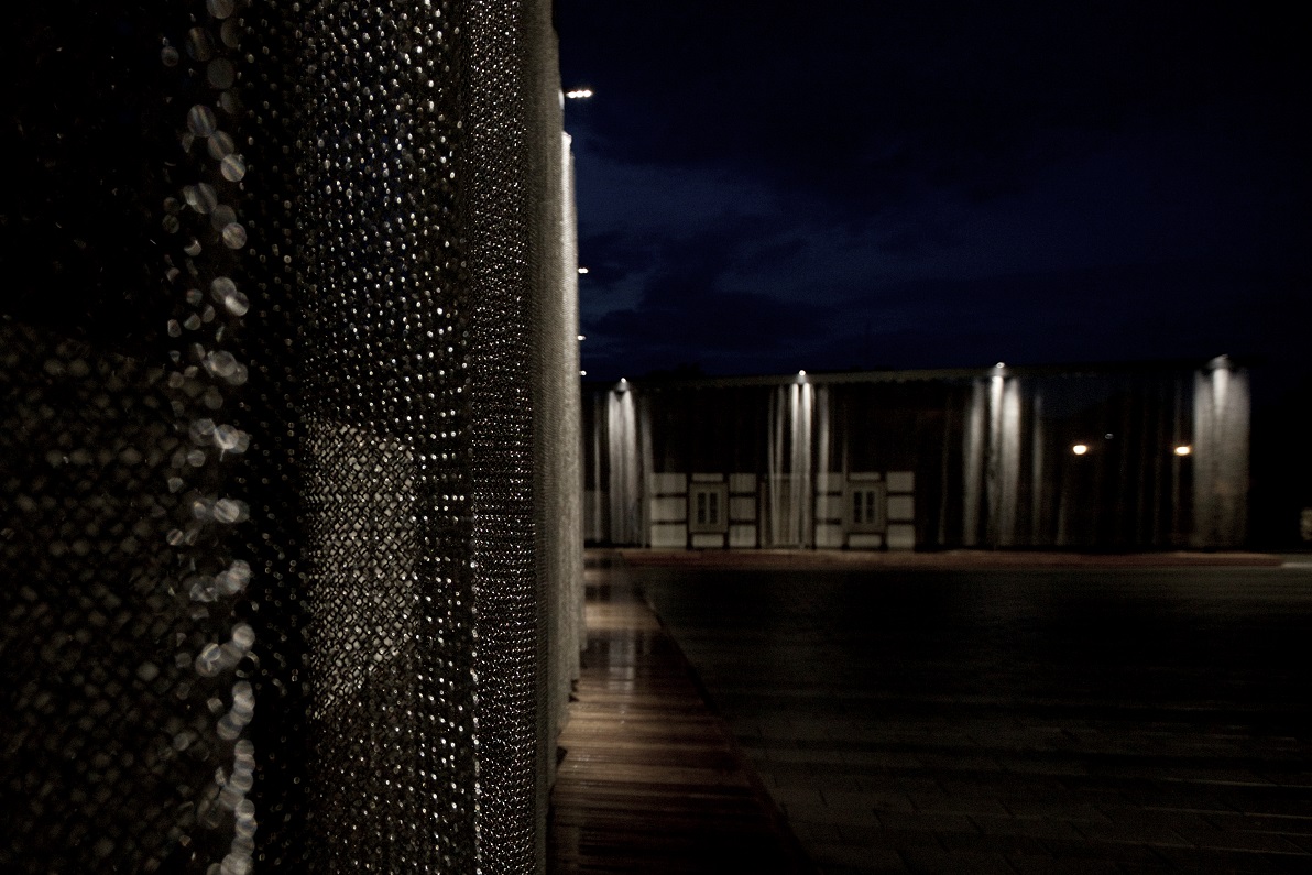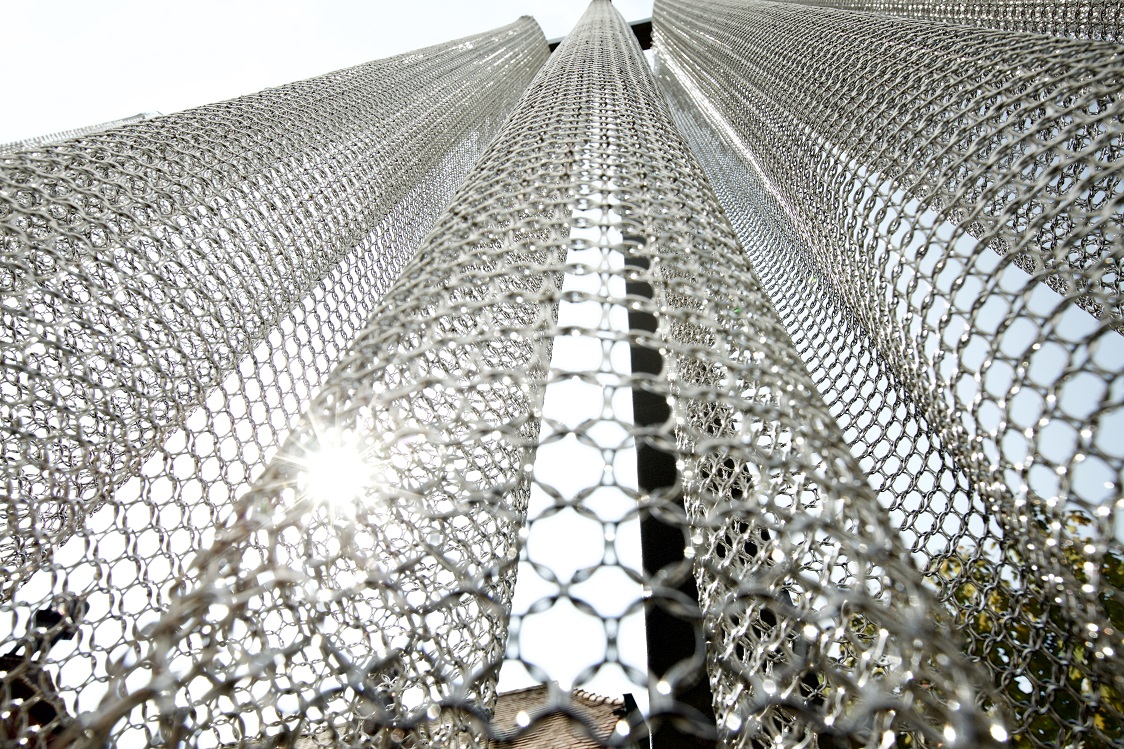 Mehrere bewegliche Segmente fügen eine Einheit, die sowohl am Tag mit dem Sonnenlicht spielt und in der Dämmerung durch Lichtreflexionen oder Projektionen ihre Vielfalt zum Vorschein bringt.